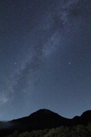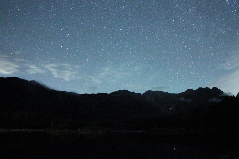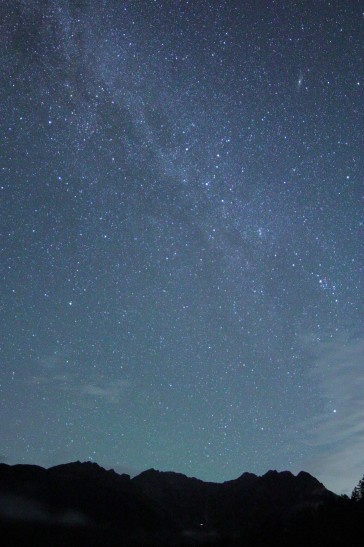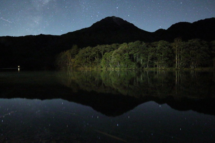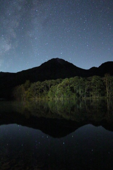 湖面に星がたくさん映り込み、天の川が穂高連峰から焼岳に流れていました。